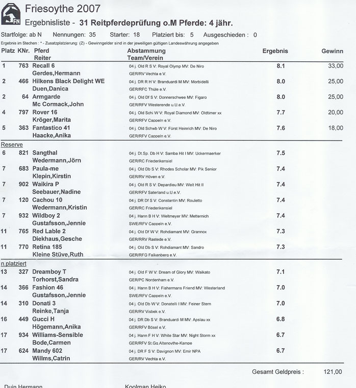 Ähnlich schön wie das sommerliche Wetter starteten heute unsere Younters in Friesoyte. ROSARIA (v. Rosario) konnte mit John in der Reitpferdeprüfung für 3 jähr. mit 7.8 einen 3. Platz erreichen und sich somit fürs Finale qualifizieren. Petra und SOURIS (v. Sandro Hit) konnten bei Ihrem ersten Start der Saison eine gute 7,4 erreiten und sich in einer Dressurpferdeprf. Kl. A plazieren. |